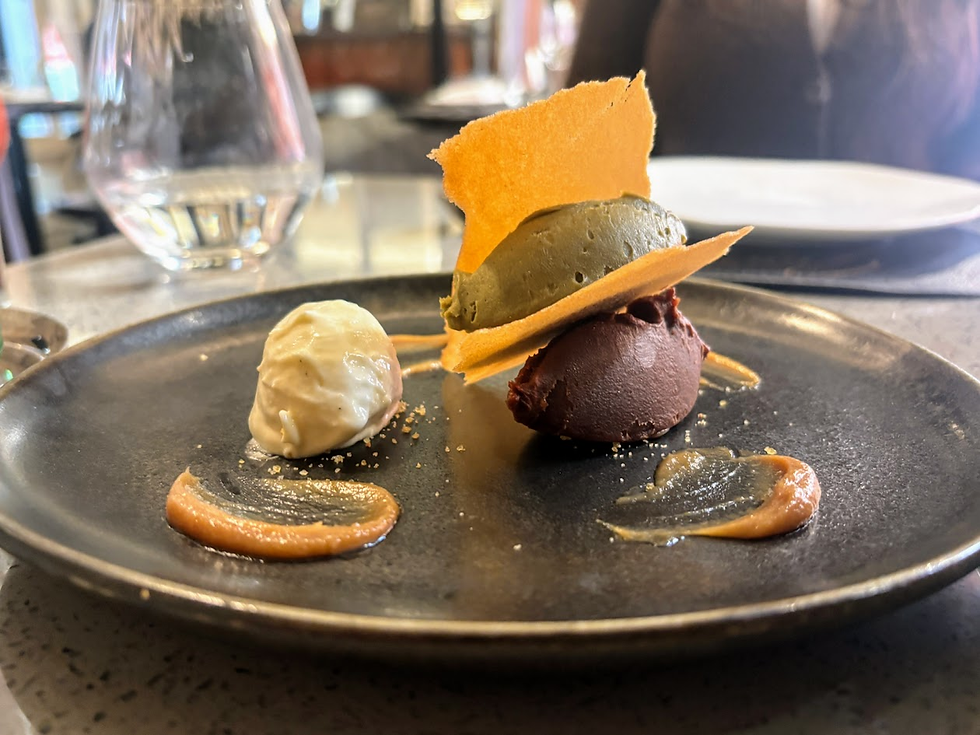 A modern stack, Valrhona dark chocolate crémeux in a tight quenelle, wafer balanced on top, pistachio crémeux above that, another wafer sealing the deal. Alongside, white chocolate ice cream. Smears of caramel and yuzu cutting across the plate like brushstrokes.