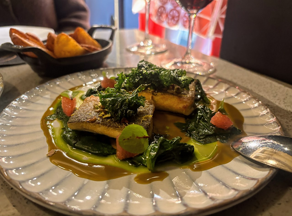 The fish itself was soft, almost buttery, flaking with the slightest pressure. The skin crackled. Kale and nuts added sharp, dry crunch against the yielding flesh. Then the grapefruit cut straight through, not sweet, not bitter, just clean. Acid again, doing its quiet work.