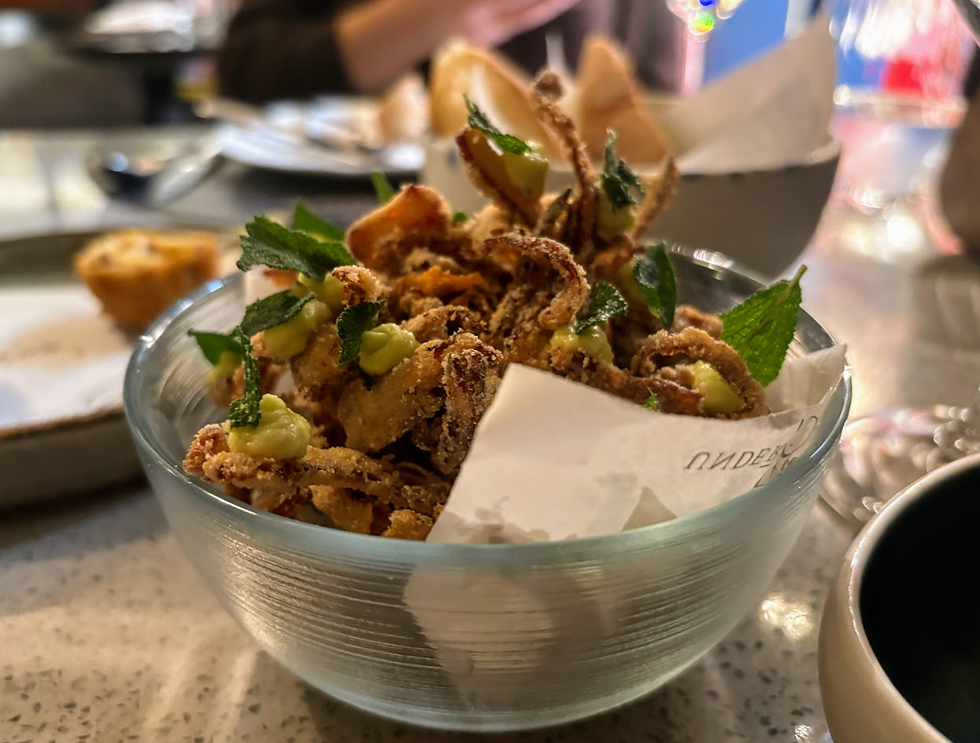 They came in a glass bowl, a small mound of golden brown, irregular and unapologetic. Tarragon sauce dotted over the top in restrained little pools, delicate leaves resting like they’d wandered in from a garden that had no idea what violence had just occurred in the fryer.
