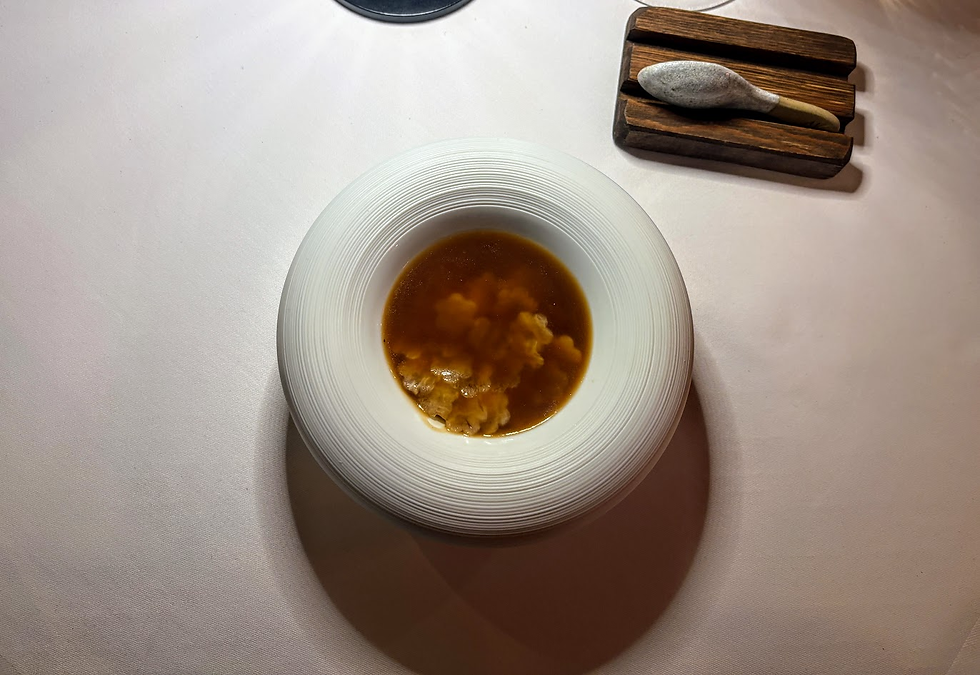 The citrus hit first, bright, almost sweet, before the brine crept in. Then the depth of the dashi followed, grounding it. Hazelnuts buried underneath gave it crunch, something to bite into so it didn’t just dissolve into a clever idea.