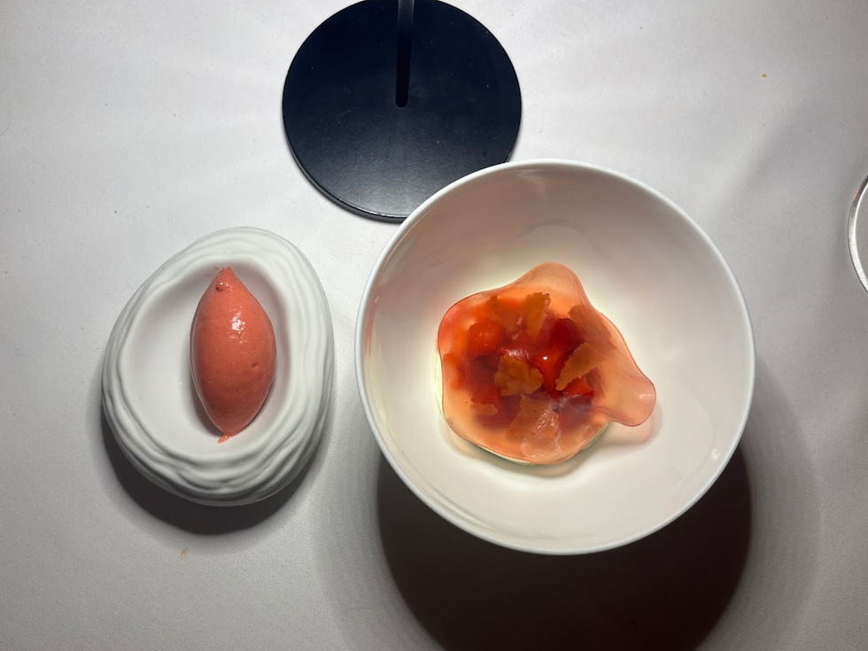One clean, almost minimal, a quenelle of strawberry sorbet, sharp in colour, holding its shape like it meant it.