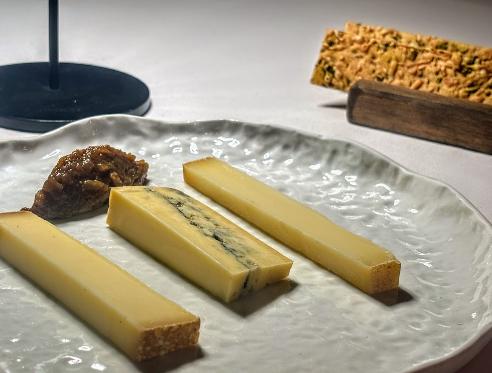 Fig chutney on the side. Dark, sticky, just enough sweetness to pull everything together without turning it into dessert. Crackers so thin they barely held, laced with cheese themselves, like they didn’t trust anything on the plate to stand alone.