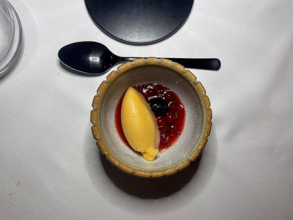 An orange quenelle of mandarin sorbet sitting over a deep red pool of berries.